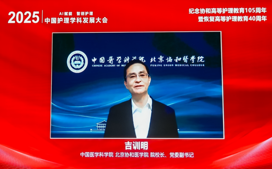 中国医学科学院北京协和医学院院校长吉训明院士代表院校对大会的顺利召开表示热烈祝贺。他表示,护理学科承载着守护生命健康、促进疾病康复的崇高使命,是医学卫生健康事业的重要支柱与核心力量。协和护理开创了我国高等护理教育先河,时刻谨记“严谨、博精、创新、奉献”的协和校训,恪守着“勤慎警护”的护理箴言,为我国护理学科发展贡献了协和力量。吉训明院校长期待全国护理同行凝聚力量,为护理学科的发展注入新的活力和智慧,在科技创新的浪潮中实现跨越式发展,为增进人民健康福祉贡献磅礴力量。