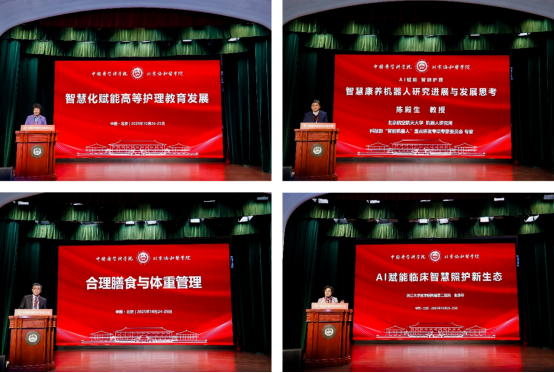 主旨报告环节,四位专家学者分享了前沿研究成果和实践经验。中华护理学会理事长吴欣娟教授以“智慧化赋能高等护理教育发展”为题,深入分析了信息技术对护理教育体系的革新作用,提出了智慧护理教育的发展路径。北京航空航天大学陈殿生教授的“智慧康养机器人研究进展与发展思考”报告,系统展示了机器人技术在老年照护领域的前沿应用,为应对人口老龄化提供了技术解决方案。协和医院于康教授从临床营养学角度阐述了“合理膳食与体重管理”的智能化监测与管理方法,展现了数字技术在健康管理中的创新应用。浙江省护理学会理事长金静芬教授以“AI赋能临床智慧照护新生态”为主题,系统阐述了智能技术在临床护理中的落地经验,为构建智慧照护新模式提供了实践参考。