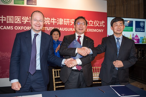 中国医学科学院牛津研究所(CAMS Oxford Institute)合作协议签字和揭牌仪式2017年12月6日下午在英国牛津大学举行。国务院副总理刘延东、国务院副秘书长江小涓、教育部部长陈宝生、科技部党组书记王志刚、国家卫生计生委副主任崔丽、驻英国使馆大使刘晓明以及参加第五次中英高级别人文交流代表团成员,国家卫生计生委参加第三届中英卫生政策对话有关代表,牛津大学常务副校长罗伯特·伊斯顿(Robert Easton),前英国医学科学院院长、牛津大学钦定医学主席(Regius Chair of Medicine)约翰·贝尔爵士等英方领导及科研人员和留学生代表,院校曹雪涛院校长、郑忠伟副院校长、张学副院校长以及有关部门负责人、部分所院负责人和科研人员代表等共100余人参加仪式。郑忠伟副院校长主持了签约和揭牌仪式。