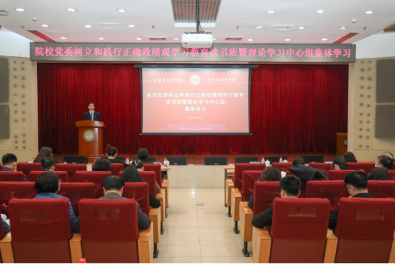 吉训明同志认真领读《政绩观问题是一个根本性问题》和《树立和践行正确政绩观,起决定性作用的是党性》原文,并结合学习体会和院校工作,从政绩观的实践指向、目标导向与责任担当三个方面,对院校领导及全体党员干部提出进一步要求。