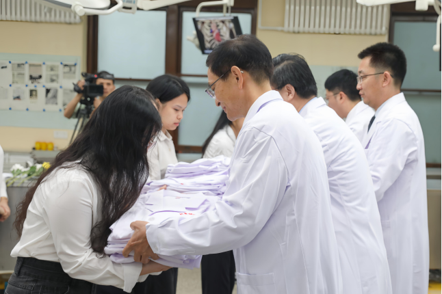 2025年10月16日上午8时,北京协和医学院九号院解剖楼实验室内庄严肃穆,2025级临床医学试点班人体解剖学开课暨白大衣授予仪式在此举行。院校党委书记邓海华、院校长吉训明、学生处处长崔庚申、试点班班主任刘文浩和蔺晨,基础学院党委书记王婧、人体解剖与组胚学系教师以及2025级临床医学试点班全体同学参加仪式。