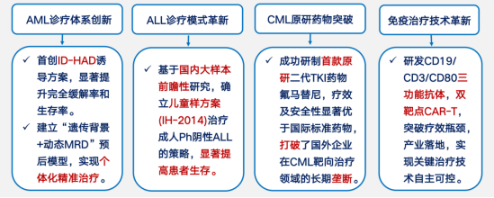 项目通过“临床问题导向-基础机制探索-技术创新研发-临床转化应用”的闭环研究路径,在白血病三大主要亚型及前沿免疫治疗领域均取得标志性成果,形成完整的、具有自主知识产权的白血病创新治疗体系,显著提升了我国白血病的精准诊疗水平,实现了从基础研究到临床应用的跨越。
