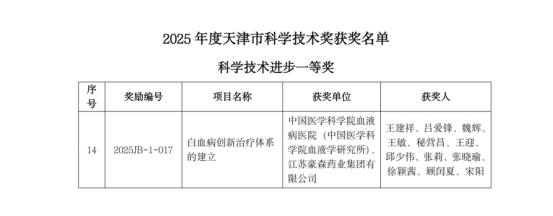 2026年4月20日,天津市人民政府印发了《关于颁布2025年天津市科学技术奖的决定》(津政发〔2026〕7号)。由国家血液系统疾病临床医学研究中心主任、血液病医院临床首席专家王建祥教授牵头完成的“白血病创新治疗体系的建立”项目荣获2025年度天津市科学技术进步一等奖,标志着血液病医院在白血病精准诊断与治疗领域实现了重大突破。