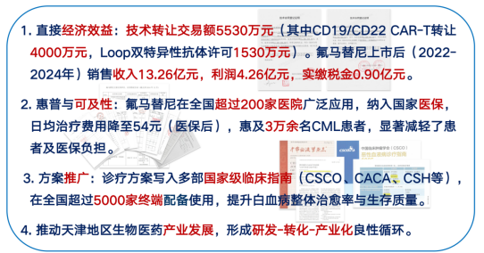 项目通过系统性创新研究,显著提升了我国白血病精准诊疗的整体水平,实现了从基础研究到临床应用的高效转化。自主研发的首个国产原研二代TKI药物氟马替尼成功上市并纳入国家医保,日均治疗费用降至54元,累计惠及超过3万名CML患者,大幅减轻了患者及医保的经济负担,打破了进口药物的垄断格局。针对复发难治型白血病,项目团队创新性研发了CD19/CD22双靶点CAR-T细胞治疗技术、CD19/CD3/CD80三功能抗体等免疫治疗新方案,技术转让总额5530万元。项目建立的精准诊疗体系被纳入多部国家权威指南,通过规范化推广在全国范围内显著提升了白血病患者的缓解率、生存率和生活质量。在天津乃至全国,项目形成了研发-转化-产业化的良性循环,带动了国家生物医药产业发展,为全国白血病防治提供了关键技术支撑与示范模式,具有重要的社会经济效益和广泛的推广应用价值。
