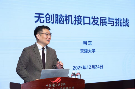 明东教授以“无创脑机接口发展与挑战”为题,详细阐述了国内外脑机接口技术的发展动态,系统介绍了天津大学团队在核心电子器件、高端专用芯片等方面的最新进展及产业化应用情况。他表示,脑机交互与人机共融领域的发展是新质生产力的典型代表,将为我国混合智能、类脑智能、医疗康复等国家重大需求注入新动能。
