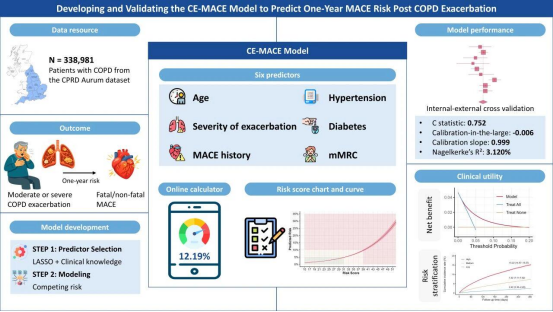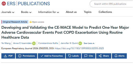 2026年3月5日,北京协和医学院群医学及公共卫生学院(群公学院)王也副研究员与伦敦帝国理工学院(Imperial College London)Jennifer K. Quint教授团队在《欧洲呼吸杂志》( European Respiratory Journal )在线发表了题为“Developing and Validating the CE-MACE Model to Predict One-Year Major Adverse Cardiovascular Events Post COPD Exacerbation Using Routine Healthcare Data”的研究论文,该研究利用常规医疗数据,开发并验证了CE-MACE预测模型,精准识别慢阻肺病急性加重后一年内发生重大不良心血管事件(MACE)风险,为促进慢阻肺病多学科综合照护提供科学工具。