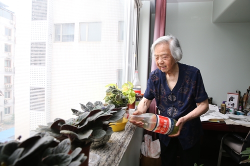 吴老喜欢素淡,她家的窗前种养了一些小花,有兰花,有红掌,有绿萝,还有自己种的青椒。她指着青椒冒出的嫩叶,露出欣喜的笑容,仿佛已经看到每天辛勤浇水劳作之后的收获一样。花中有一些也有了岁月,却依然青翠如常,吴老甚是喜爱,“这些花,我接着养,就接着开花。”她不舍得丢弃那些已经养出感情的花草。花盆不够了,她就充分利用那些废弃的塑料瓶,在塑料瓶里养花,用废弃的矿泉水瓶浇花。废旧的东西她都想着再利用,墙边小桌上更是放满了那些等待被循环利用的废旧瓶瓶罐罐。基础所离退休处的干部看到这一幕不禁地说“吴老家的生活真是太节俭简朴了。”
