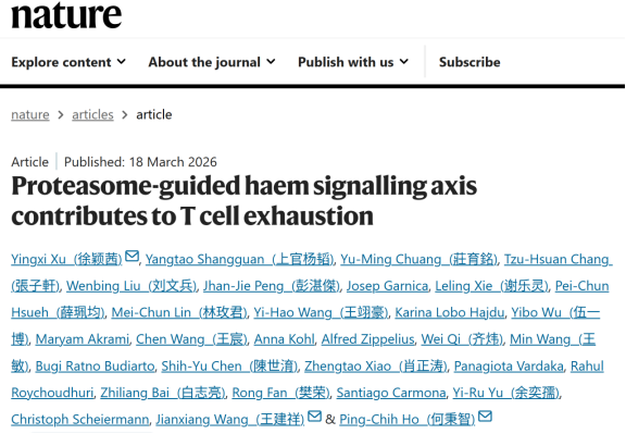 2026年3月18日,中国医学科学院血液病医院(中国医学科学院血液学研究所)王建祥教授、徐颖茜副研究员以及瑞士洛桑大学路德维格癌症研究中心Ping-Chih Ho教授合作在 Nature 在线发布了题为“Proteasome-guided haem signaling axis contributes to T cell exhaustion”的研究论文。该研究发现,线粒体去极化可增强蛋白酶体活性并特异性降解线粒体蛋白,释放血红素,血红素作为转录因子调控辅因子,重塑T细胞转录调控网络。