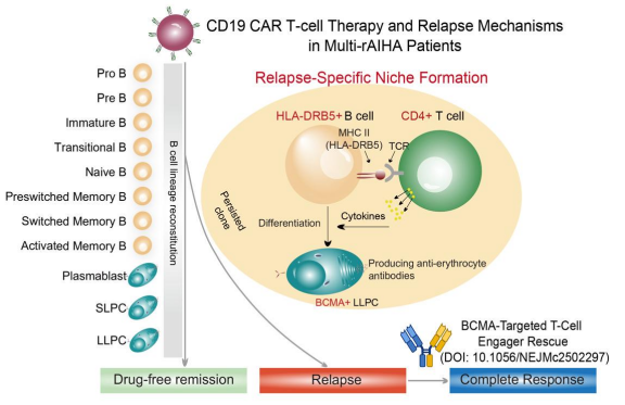 此次研究中,团队采用我国自主研发的自体CD19 CAR T细胞,针对多线药物治疗失败的AIHA患者开展临床研究,最终取得显著疗效与良好安全性,帮助患者实现长期无药物治疗缓解,为这类常规治疗无效的危重患者,提供了全新的挽救性治疗方案。至此,研究团队在国际上率先搭建起AIHA细胞免疫治疗新体系:常规药物治疗失败后,可采用自体CD19 CAR T细胞治疗;若CAR-T治疗后复发,还能通过BCMA×CD3双特异性抗体(T细胞衔接器,TCE)进行二次挽救治疗(Zhang L, et al, N Engl J Med, 2025),为AIHA患者带来临床治愈的曙光。